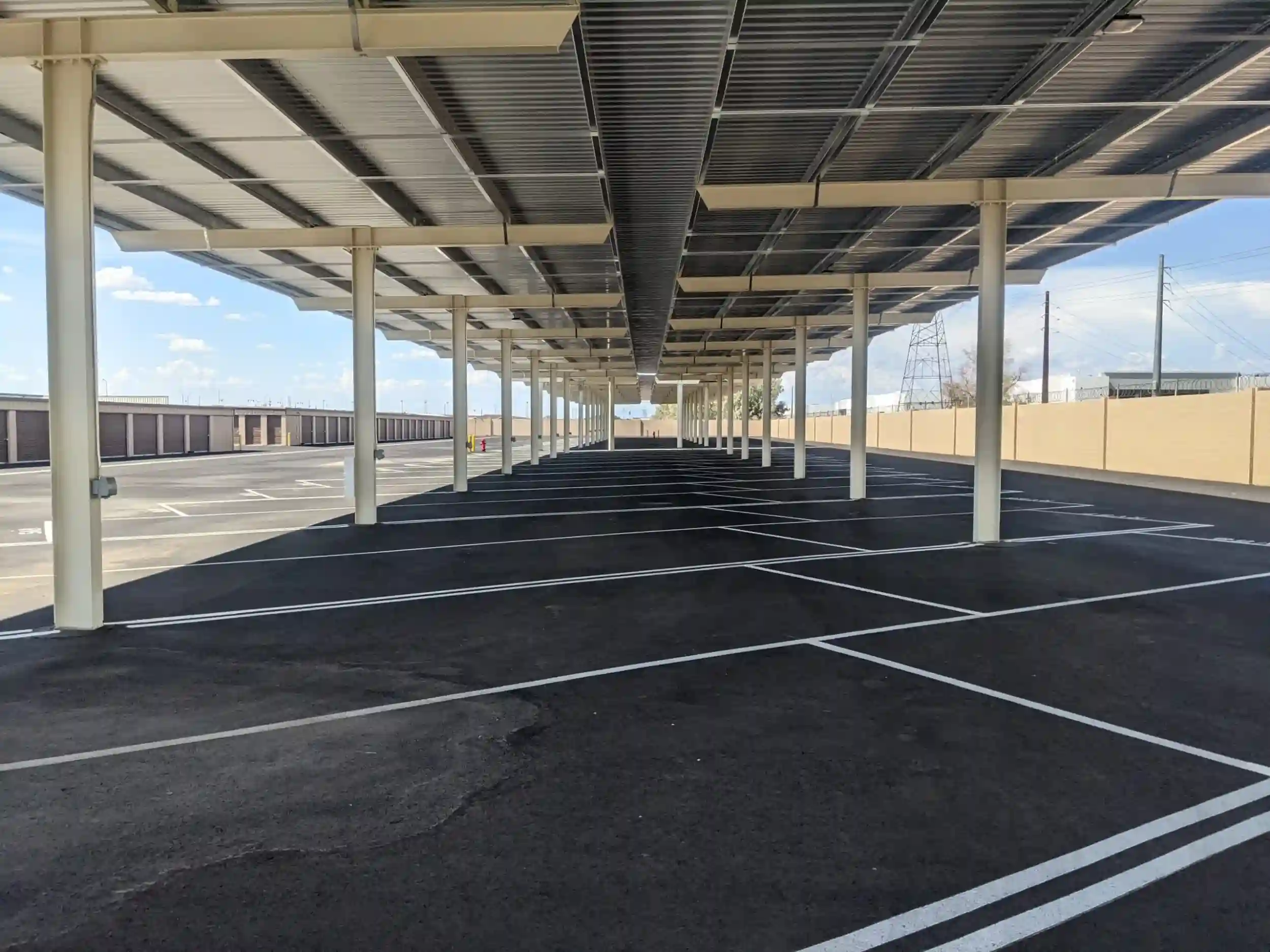 A row of covered parking spaces at River Crossing Avondale Storage & RV